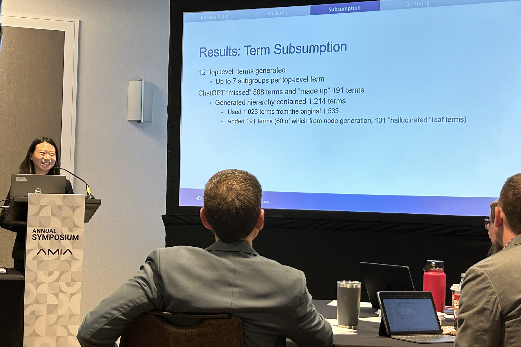 MD-PhD trainee Cindy Chen joined Lee as one of eight people to earn a place in the student paper competition. Chen presented her study “Knowledge Engineering for Medical Vocabularies Using Large Language Models.”