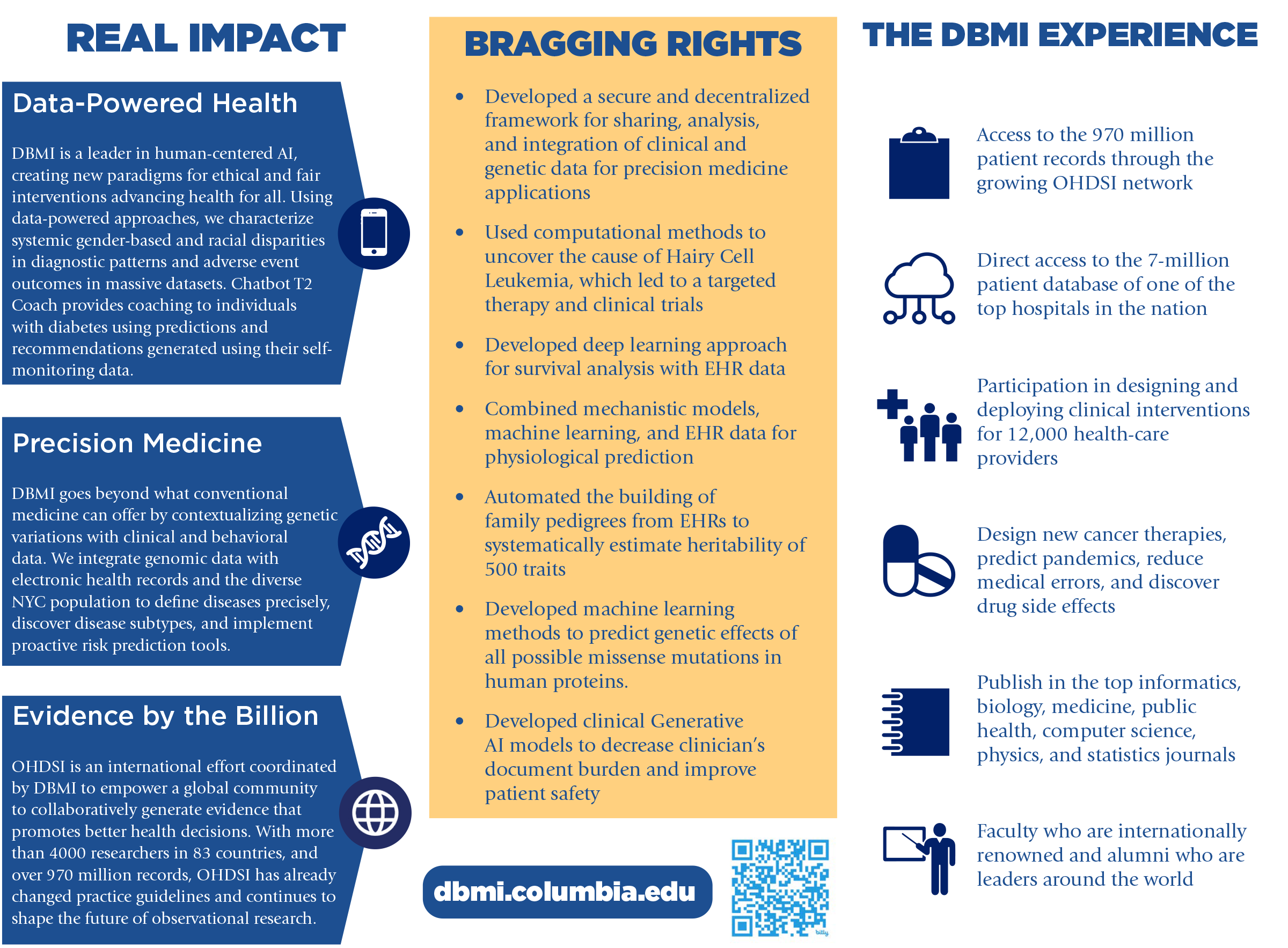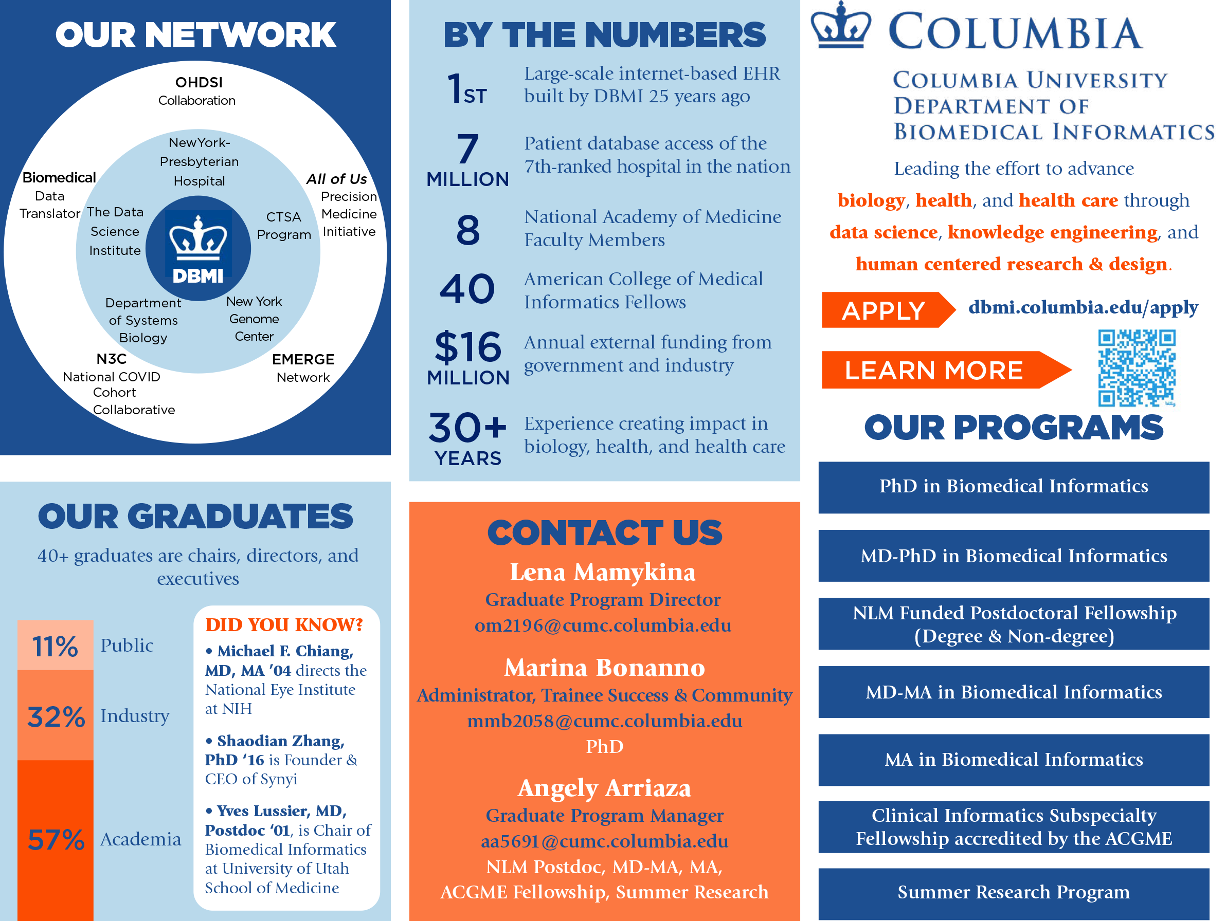 Located on the Columbia University Irving Medical Center (CUIMC) campus, the Department of Biomedical Informatics (DBMI) is both an academic department and an information services partner to NewYork-Presbyterian Hospital, a major healthcare provider in greater New York.